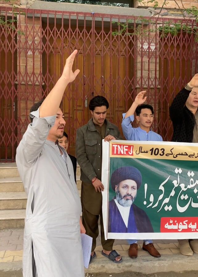 In front of a building, a group of men stands holding a banner, raising their hands in unison. The banner features a portrait of a bearded man wearing a turban. Text in Urdu is prominently displayed on the banner, and the letters "TNFJ" are also visible. The group is protesting and voicing demands, calling for the reconstruction of Jannatul Baqi.