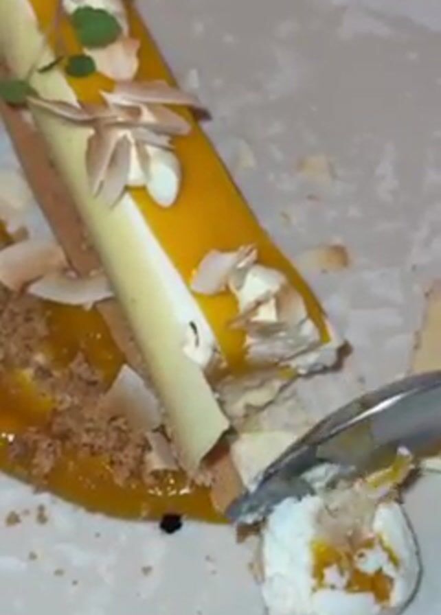 A close-up shot displays a meticulously plated dessert on a white plate. The dessert features a long, rectangular component with a white exterior, a layer of bright yellow sauce, and is garnished with slivered almonds and microgreens. A thin biscuit-like base is visible underneath one side of the rectangle. Surrounding the main dessert element is a smear of the same yellow sauce, a scattering of cookie crumbs, and several coconut flakes. A scoop of white, creamy substance is placed separately on the plate. A silver spoon cuts into the dessert, creating small pieces that mix with the surrounding elements. The lighting is bright and warm, highlighting the dessert's colors and textures. The scene suggests a high-end dining experience.