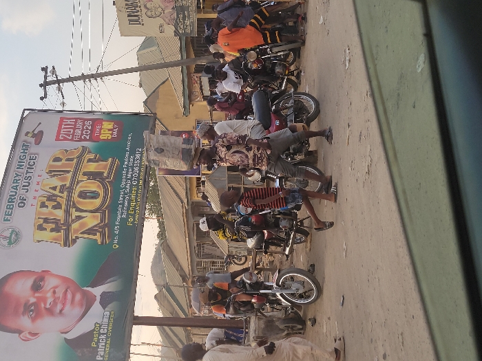 A scene in what appears to be a bustling African town, featuring a large billboard promoting a "February Night of Justice" event. The poster highlights Pastor Patrick Chima as the General Overseer and indicates the date as February 20th, 2026. Many people ride motorcycles along the roadside, with shops visible behind them. The overall scene suggests a dynamic and lively urban environment.