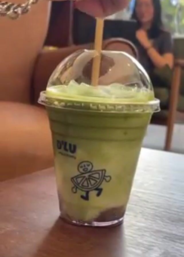 A close-up shot shows a green drink in a clear plastic cup with a dome lid sitting on a dark wooden table