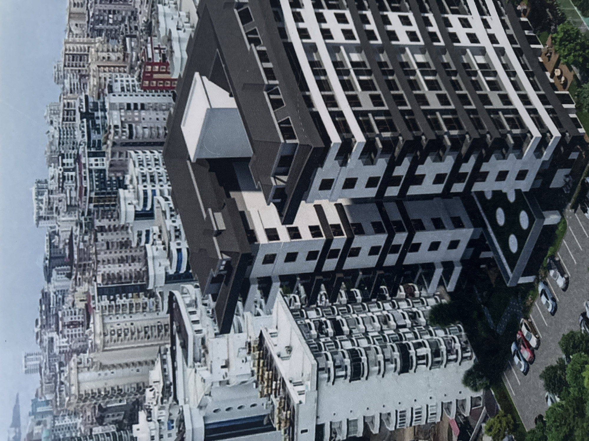 The image depicts a densely populated urban area, likely a conceptual rendering or architectural model, with a cluster of high-rise buildings dominating the scene. The structures display a mix of architectural styles, ranging from modern geometric designs with stark black and white contrasts to more traditional forms. A large, modern building with a grid-like facade and a prominent overhang is featured prominently. Numerous smaller buildings with varying heights and colors surround it. A parking area with several parked cars is visible near the base of one building. The image is rotated, presenting an atypical perspective. While there is no explicit evidence in the image that identifies the location as Alanya, Turkey, it can be deduced that it is conceptual artwork or architectural visualization of a dense urban environment of high rise buildings and infrastructure.
