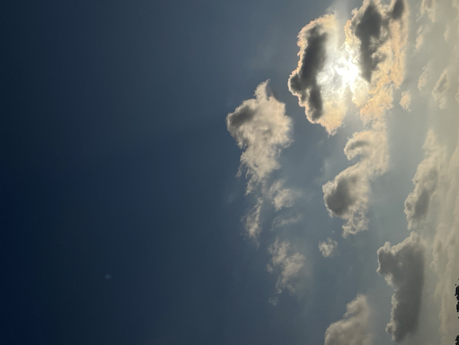 A clear blue sky contrasts sharply with a bank of bright, sunlit clouds occupying the right portion of the frame. The sun is obscured by the clouds, creating a diffused glow around their edges. The clouds are a mix of puffy, cumulus formations, some casting subtle shadows. The image is rotated, giving the impression of a vertical landscape. A small, distant circular artifact is visible in the clear blue sky.