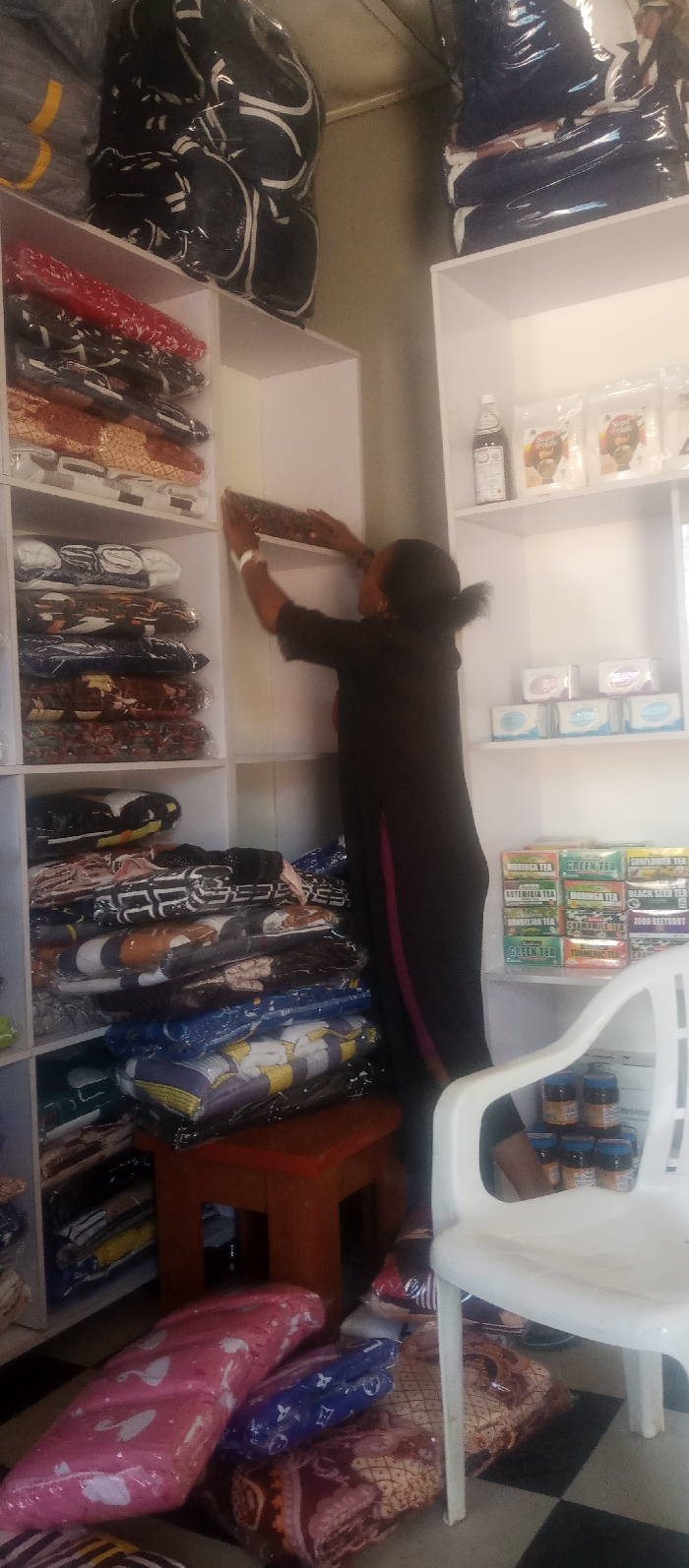 This image depicts the interior of a retail establishment located in the city of Unknown, Unknown. A female individual, observed from the back and wearing a dark long-sleeved top and dark pants with a pink vertical stripe, is actively arranging a dark, patterned, plastic-wrapped item onto a white display shelf. The scene is dominated by white, multi-tiered shelving units filled with various merchandise. On the left side, numerous plastic-wrapped textile items, exhibiting diverse patterns and colors (including red, black, white, blue, and brown), are neatly stacked on multiple shelves. On the right side, the shelves display packaged goods: the top shelf contains a dark bottle and several white pouches labeled "Sweet Potato" with a bull graphic; the middle shelf holds multiple small, rectangular boxes of personal care items in pink and blue packaging; and the lower shelves feature stacks of various tea boxes labeled "Moringa Tea," "Green Tea," "Artemisia Tea," "Black Seed Tea," "Dandelion Tea," "Chamomile Tea," "Turmeric Tea," and "Zobo Beetroot," alongside several small jars with labels. In the lower center, a small, reddish-brown wooden stool is positioned, with additional plastic-wrapped textile items stacked on and around it. A white plastic chair occupies the lower right foreground. Several large, plastic-wrapped items, resembling pillows or blankets, are visible on the black and white checkered floor in the foreground. The overall environment appears to be an organized retail space.