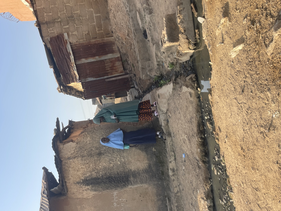 Two women in traditional Islamic dress stand on a narrow pathway between buildings. One wears green, the other blue. Buildings are made of cinder block and some have rusty corrugated metal. A polluted drainage ditch runs beside the path, filled with trash. The scene shows poverty and unsanitary conditions. The structures appear weathered and rundown.