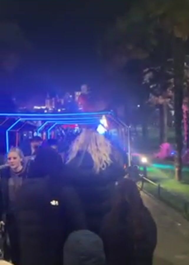 A crowd of people walks under a tunnel of neon lights in a park at night