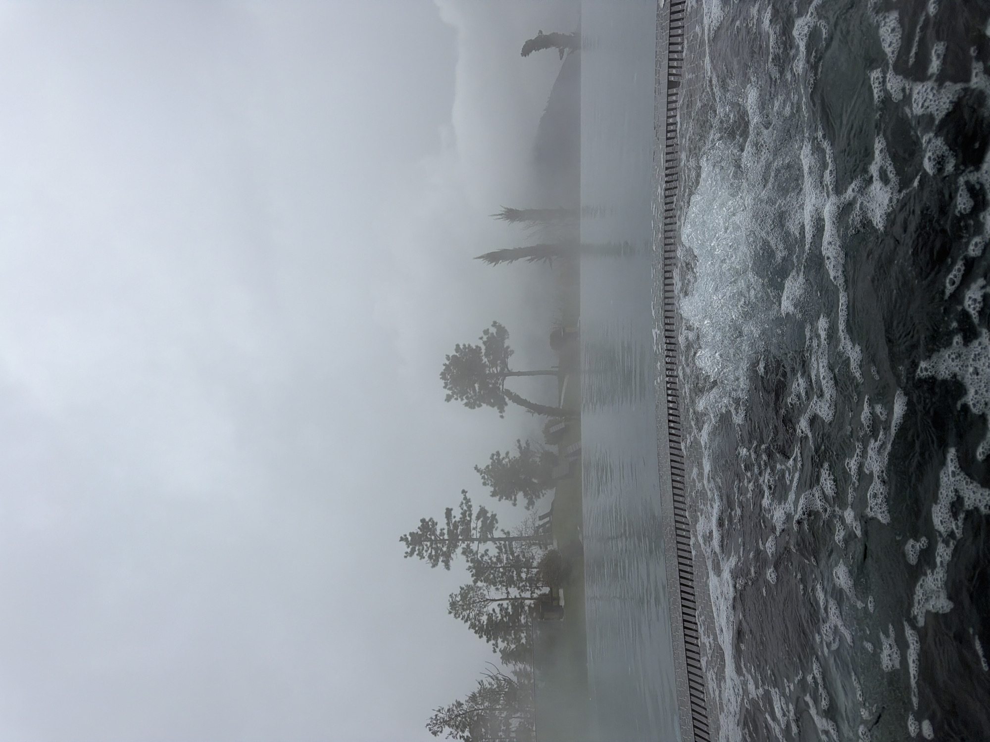 The image depicts an infinity pool with frothy water, appearing outdoors on a foggy day