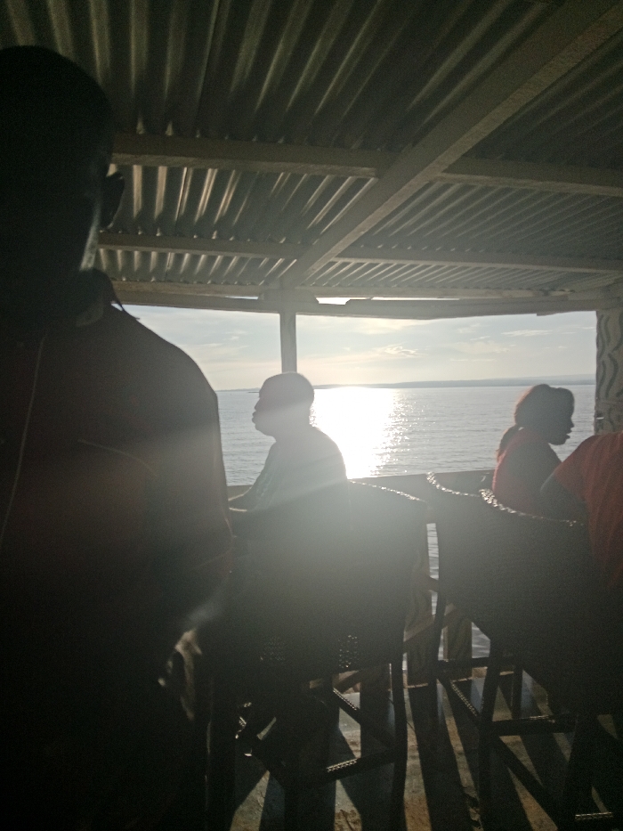 view from inside a restaurant, with a corrugated metal roof, facing Lake Victoria in Tenwek, Kenya. Three people are sitting at a table, silhouetted against the bright afternoon sun. The people are facing the lake, which is calm and reflecting the sunlight. The chairs are black wicker, and the table is out of view. The location is near the shores of Lake Victoria, in the town of Tenwek, Kenya, with coordinates -0.743 latitude, 35.358 longitude.