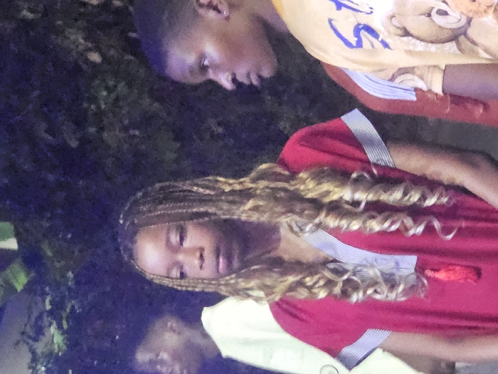 three individuals. The central figure is a young woman with long, braided blonde hair. She's wearing a red garment trimmed with white and has a serious expression. Above and to the right, another person is visible, wearing a yellow shirt with a bear illustration. Below and to the left, a third individual is partially visible. The lighting is dim, casting shadows across the scene. The background appears to be outdoor foliage, suggesting an evening or nighttime setting.