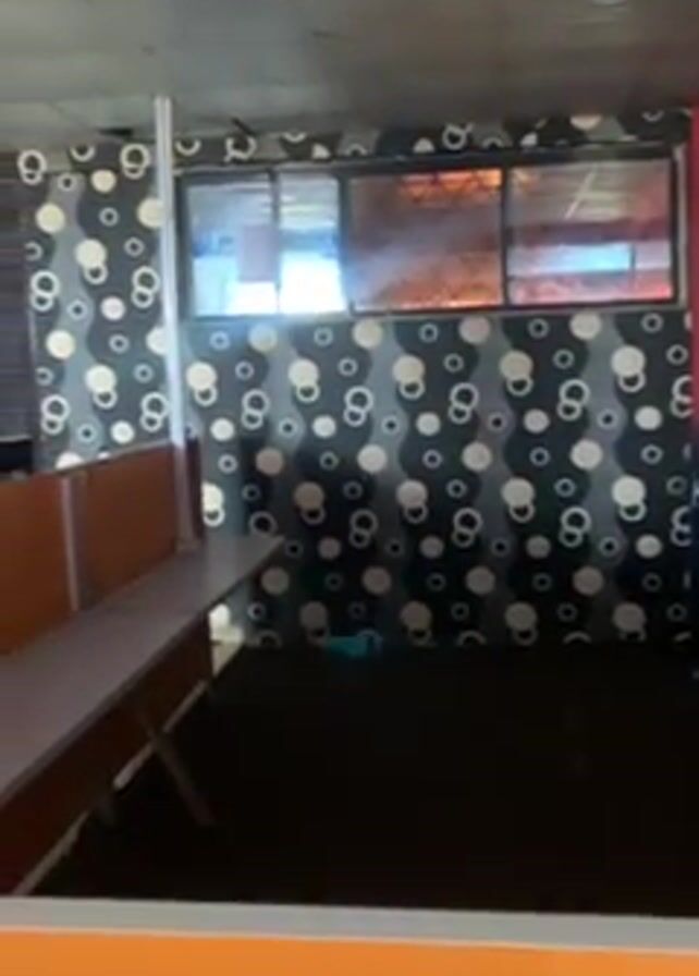 interior of an office space. The room has dark carpeting, a grey patterned wallpaper with white and black circles, and a drop ceiling. There's a row of cubicles with orange dividers and light-colored desks. There are a set of windows with visible sunlight streaming in. The camera pans slightly across the scene.