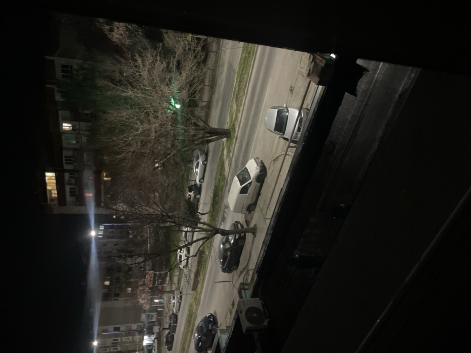 The image depicts a nighttime street scene in the city of Pazardzhik, Bulgaria, observed from an elevated perspective, likely a window or balcony. The foreground shows a dark, indistinct railing or window frame, with an outdoor air conditioning unit visible on the lower left. The midground features a two-lane urban street, illuminated by streetlights. A grassy median strip separates the traffic directions and contains several bare deciduous trees. A strong beam of light from a streetlight crosses the upper left portion of the image. Parked vehicles line both sides of the street. On the side closer to the viewer, a dark SUV is parked partially on the curb, followed by a white panel van, and then a silver sedan. On the opposite side of the median, several other cars, including a silver sedan and a light-colored SUV, are parked parallel to the curb. A subtle green light emanates from within the branches of a tree on the right side of the median. The background consists of multi-story residential buildings. A structure on the left has several illuminated windows. A taller building on the right also displays multiple lit windows on its upper floors, indicating habitation. No individuals are discernible, and no active events or interactions are observed within the static scene.