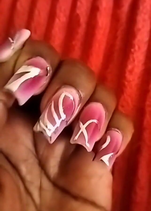 A close-up video shows a hand with manicured nails. The nails are square-shaped with a pink ombre base and white abstract designs. The hand is dark-skinned and is positioned against a red, textured background. The hand moves slightly, showcasing the nail design from different angles.