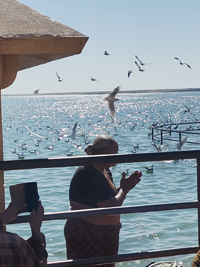 The image depicts a daytime scene in Veraval, India, at the edge of a large body of water, likely the Arabian Sea. A woman, seen in profile from the waist up, stands partially submerged in shallow water. She has light-colored hair styled in a bun, wears a dark top, and a patterned skirt or sarong. Her hands are held together near her chest, palms open, suggesting an act of offering or feeding. Numerous birds, primarily gulls or terns, are present throughout the scene. Dozens are visible swimming on the sparkling, sun-dappled water surface, while several more are in various stages of flight across the clear blue sky and over the water. One prominent bird is captured in mid-flight with outstretched wings in the upper-right area of the frame, and another descends in the middle-ground. In the foreground, a dark metal railing extends horizontally, partially obscuring the lower half of the scene. To the left of the woman and below the railing, hands are visible holding a dark electronic tablet or phone, pointed towards the water and the woman. A light-colored concrete architectural overhang is visible in the upper-left corner of the frame. The horizon line in the background shows a distant, low-lying landmass or breakwater under a bright, cloudless sky.