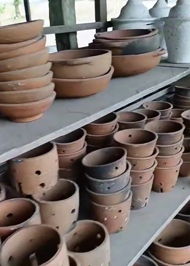 series of shelves filled with pottery and bags of soil. The top shelf has large, shallow bowls and white concrete decorations. The lower shelves are filled with terracotta pots, some of which have holes in the sides. The shelves are made of unfinished wood. The environment appears to be a shop or storage area.