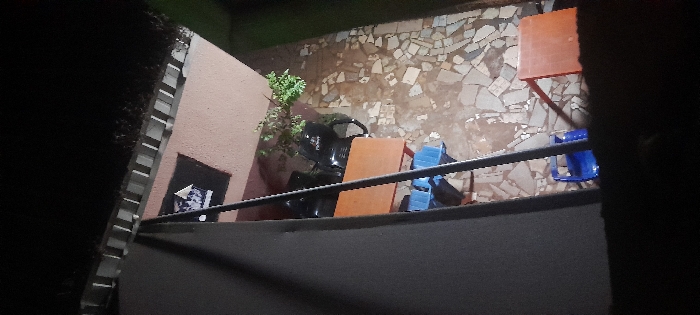 A view from above looks onto a small outdoor space at night. A wall with a mosaic tile pattern serves as a backdrop. A plant stands near a pinkish wall, next to an arrangement of items including a black chair and orange and blue objects. A railing runs horizontally across the scene, suggesting a balcony viewpoint, while darkness dominates the foreground edges.