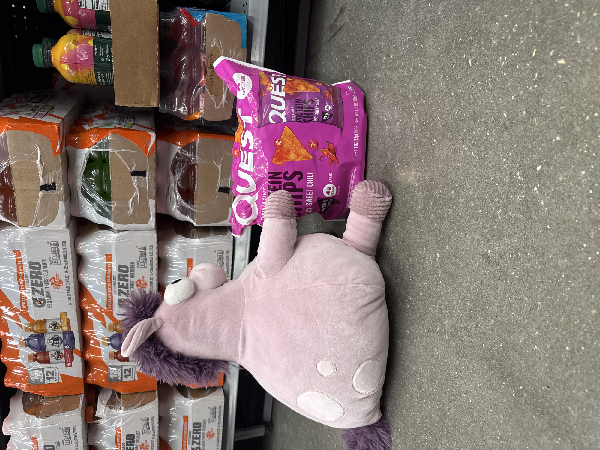 The image depicts a bag of Quest Tortilla Style Protein Chips in Spicy Sweet Chili flavor, lying on the floor beside a shelf stocked with Gatorade Zero sports drinks