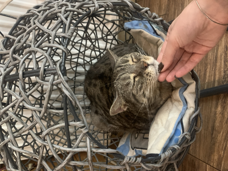 - "The scene depicts a domestic tabby cat resting within a woven grey and dark grey wicker-style cat bed, situated indoors in Lviv, Ukraine" by FM-BI1Cp2, licensed under CC BY 4.0