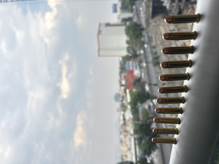 Nine bullets line the right edge of a frame. Each bullet appears to be brass with a copper tip, resting on a grey, slightly curved surface. Outside, a cityscape is visible through a window, with a white building, trees, and a highway with moving cars in the background. Above, a sky filled with puffy, grey clouds fades into the distance. The image captures a contrast between the bullets and the urban scene.