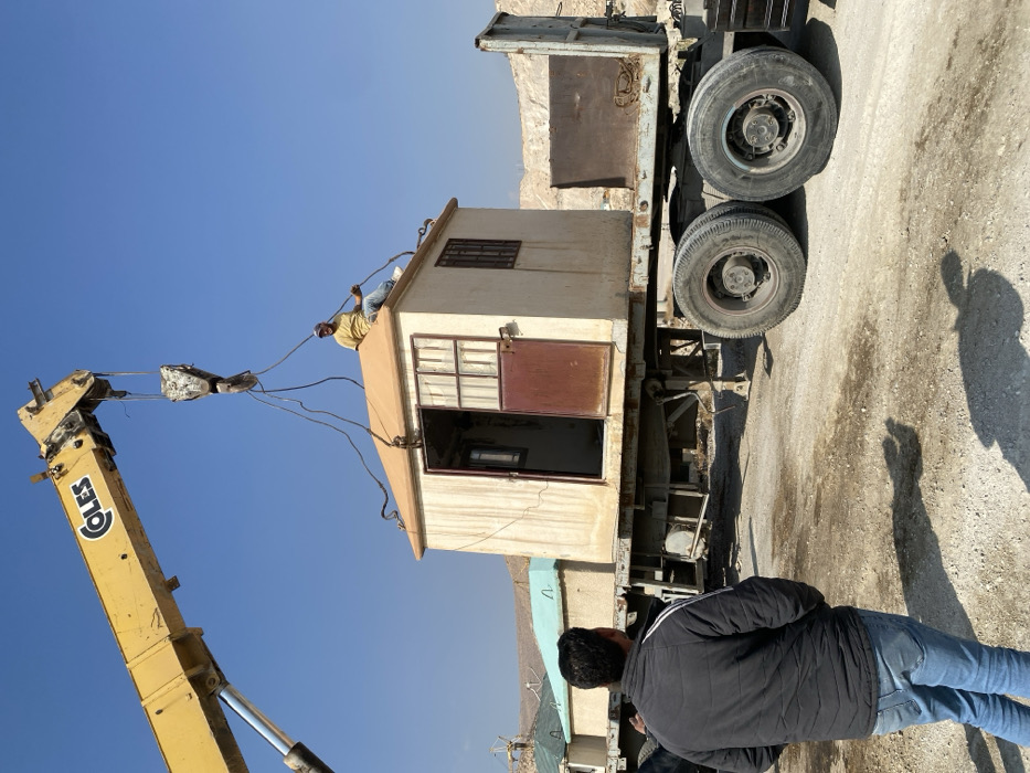 An outdoor scene in Dahiyat Harasta, Syria, depicts a daytime operation involving the relocation of a portable structure. A large yellow mobile crane, with "COLES" visible on its boom, is positioned to lift or lower a rectangular, weathered, light-colored portable unit. One male individual, wearing a yellow shirt and a light-colored cap, is seated on the roof of this unit, actively holding onto cables or ropes connected to the crane's hook. The portable unit, which has a partially open dark brown door and a window, rests on the flatbed of a rusty, multi-axle semi-trailer truck. Another similar but smaller, rounded portable structure is also present on the truck's flatbed further back. In the foreground, a second male individual, wearing a black jacket and blue jeans, stands facing away from the camera, observing the activity. The ground is composed of dirt and gravel. The background features arid, light-colored hills under a clear blue sky. Shadows are distinct on the ground due to bright sunlight.