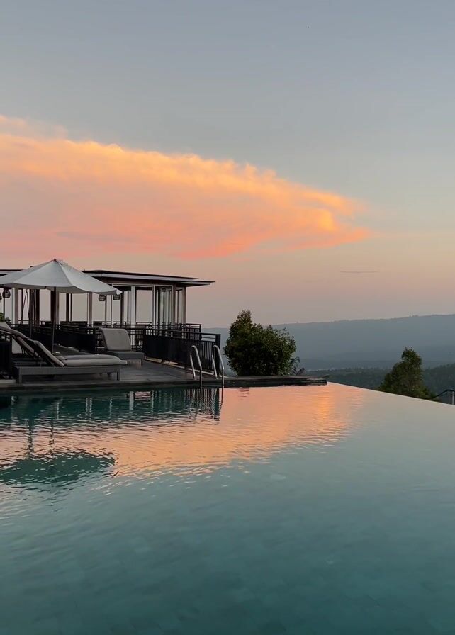 n infinity pool with a scenic mountain view during sunset. The sky is painted with soft hues of pink and orange, with a cloud adding to the drama. The sun’s glow is reflected on the water, adding a tranquil touch to the scene. On the edge of the pool is a pavilion-like structure with lounge chairs. The scene evokes a sense of serenity and luxury.
