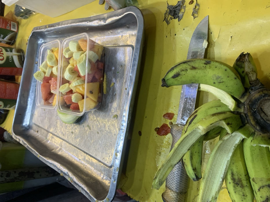 A silver tray holds two plastic containers filled with chopped fruit: watermelon, pineapple, and sliced bananas. A knife rests on a yellow surface next to peeled green bananas. Pieces of cut fruit are scattered nearby. Some cans are visible in the lower left corner.
