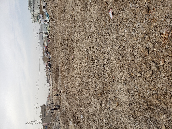 This image displays an open, disturbed area within the city of Arghandab, Afghanistan, under an overcast sky