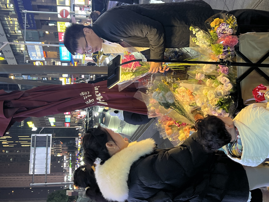 An outdoor, nighttime scene depicts a flower stall on an urban street in Liangjiang, China