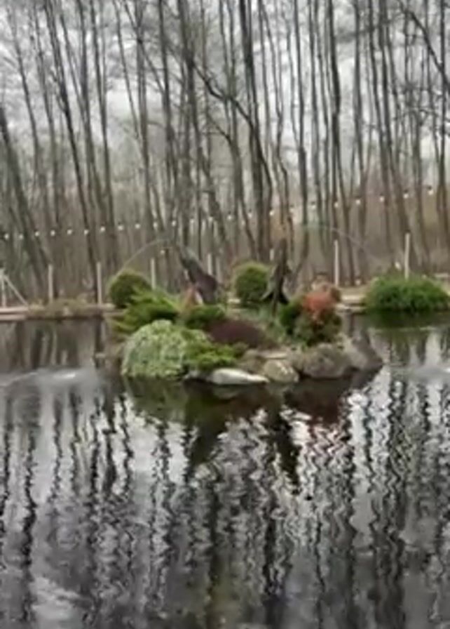 pond with a small, rocky island in the center. The island is covered in various plants and two artificial birds. The pond reflects the overcast sky and surrounding bare trees. A few ducks swim in the pond and a small fountain spouts water. Strings of lights can be seen hung between the trees in the background. The weather appears to be overcast and possibly cold.
