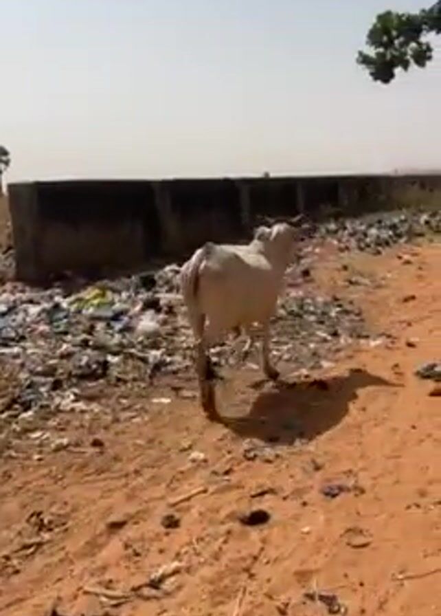white cow walking in a trash-strewn environment with reddish-brown soil