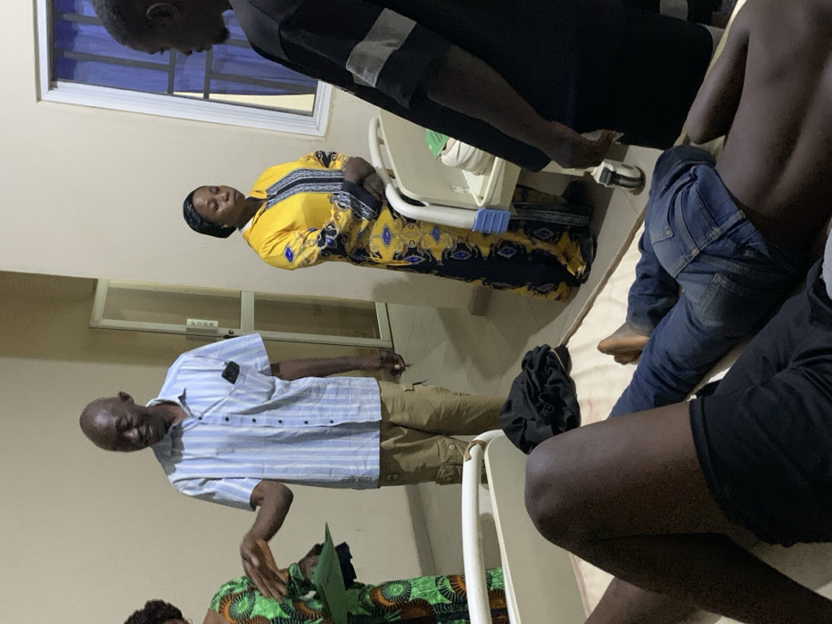 A group of people gather in a room. A woman in a yellow and blue patterned dress sits in a chair, seemingly asleep. A man in a blue striped shirt and khakis stands nearby. Several other people are partially visible, including one in jeans and another in shorts. A medical bed is situated behind the seated woman. The atmosphere appears somber and possibly related to a hospital setting. A window is visible in the background, as is a portion of a door or partition.