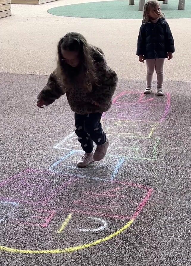 A young girl with long hair and a spotted jacket plays hopscotch on an asphalt playground