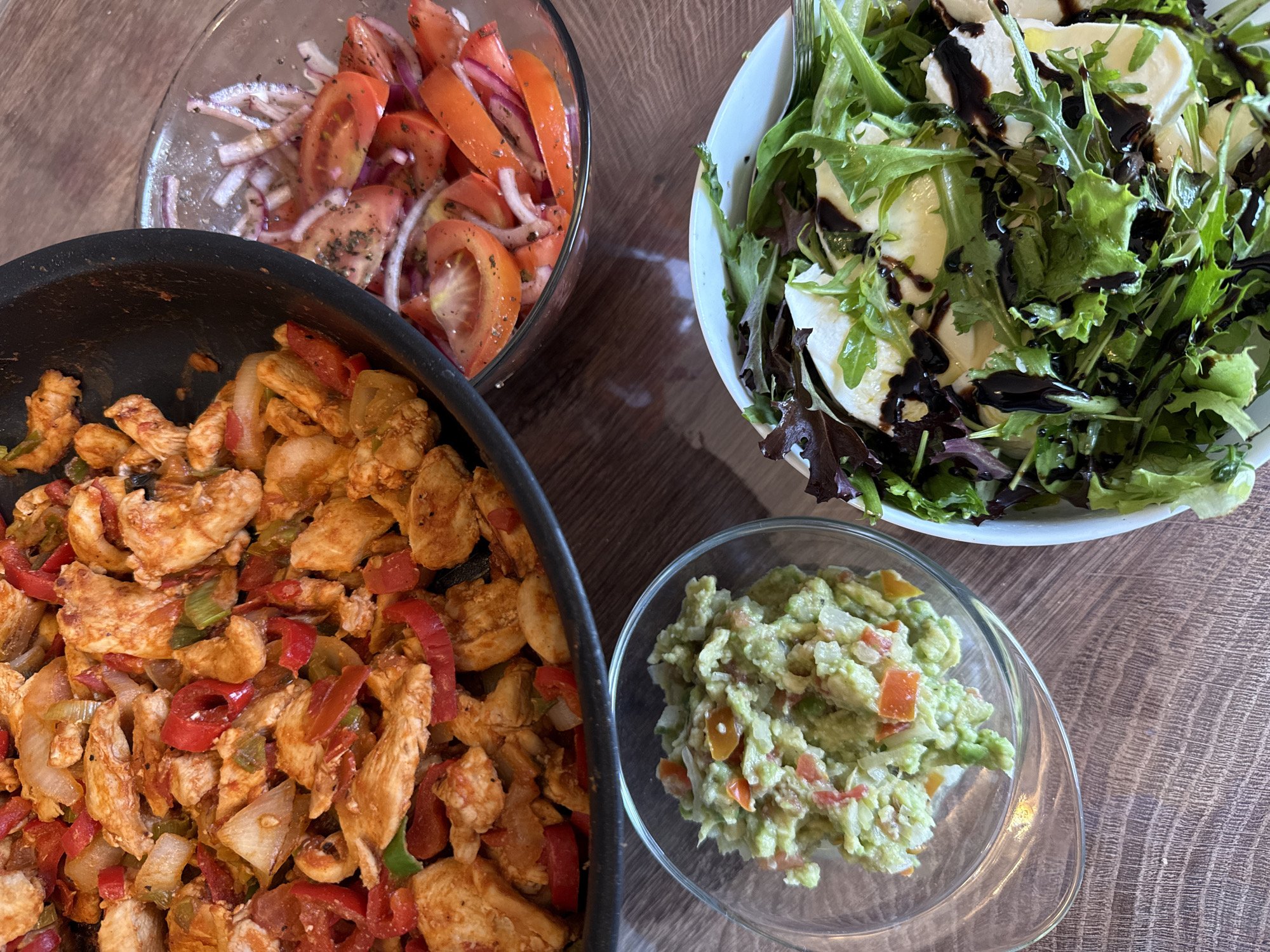 The image presents a collection of food items arranged on a wooden surface. A black pan contains sauteed chicken with red and green bell peppers and onions. Nearby, a clear glass bowl holds a tomato and red onion salad, lightly seasoned. A white bowl contains a green salad with mozzarella cheese, drizzled with balsamic glaze. A separate clear glass bowl displays guacamole. There is no indication of the location.