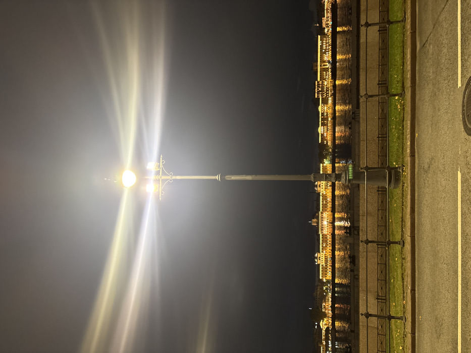 The image depicts a nighttime urban scene along the Neva River in Saint Petersburg, Russia. The view is from a street on an embankment, likely Universitetskaya Embankment on Vasilyevsky Island, looking north towards the Palace Embankment and the Winter Palace. In the immediate foreground, a dark asphalt road with a faded white lane marker spans the bottom of the frame. A dark metal fence with decorative scrollwork separates the road from a narrow strip of green grass containing scattered yellow leaves. Behind this, a dark, low stone or concrete embankment wall is visible. A tall, dark grey, ornate lamppost stands prominently in the center of the frame, extending from the lower mid-section almost to the top. Its main spherical light source emits an intense yellow-white glare with pronounced horizontal and vertical lens flares, dominating the upper portion of the image. Two smaller, rectangular downward-facing lights are also mounted on the lamppost's decorative arms. A small, illegible green sign is affixed to the lower section of the lamppost. Beyond the embankment, the dark surface of the Neva River occupies the midground. The water reflects the yellow-orange lights from the distant buildings, creating shimmering vertical streaks. On the far bank, a continuous line of multi-story classical buildings is brightly illuminated with warm yellow-orange lights outlining windows, cornices, and architectural details. The most prominent structure, centrally located, is the Winter Palace (part of the State Hermitage Museum), identifiable by its extensive facade and numerous lit windows. The sky above is dark grey to black, with ambient light from the lamppost and distant buildings casting a faint glow. No people or vehicles are visible. The scene is static.