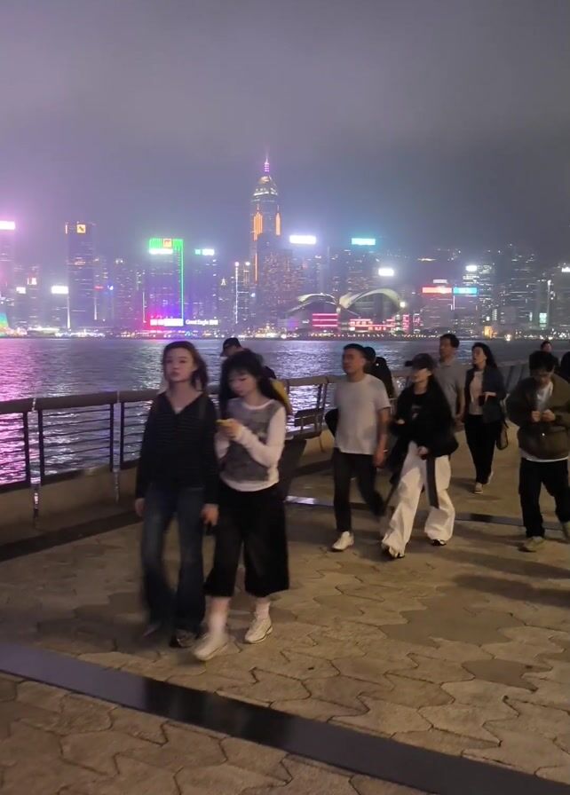 night scene of a waterfront promenade with a city skyline in the background. Several people are walking along the promenade, some in groups and some alone. The skyline is brightly lit with a variety of colors, and the water reflects the lights. The overall atmosphere is lively and urban.
