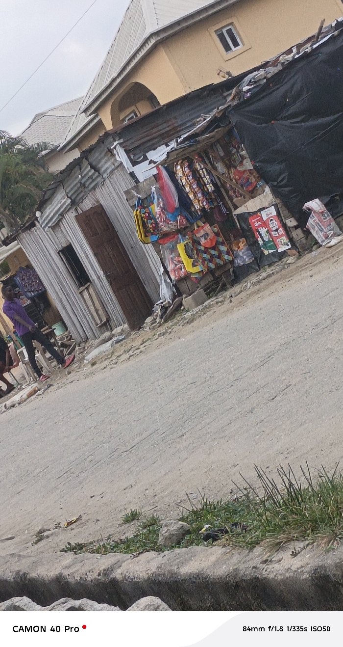 The image displays a tilted street scene in Ado, Nigeria, under an overcast sky. A light gray, unpaved road occupies the lower portion of the frame, bordered by a concrete-lined drainage ditch containing sparse green vegetation. On the left, a male subject wearing a purple long-sleeved shirt, dark trousers, and red shoes is positioned near a single-story structure constructed from corrugated metal sheets, which features a wooden door and a small, open window. Adjacent to this, on the right, is a vendor stall made from corrugated metal and covered by a black tarpaulin. This stall exhibits various packaged goods, including snacks and colorful patterned bags, hung for display and arranged on internal surfaces, with product signage visible. Behind these roadside structures, a multi-story building with a light orange-colored facade and a light-colored corrugated roof is partially visible, featuring a white-framed window. The ground around the structures is uneven, with scattered debris and concrete blocks supporting the vendor stall.