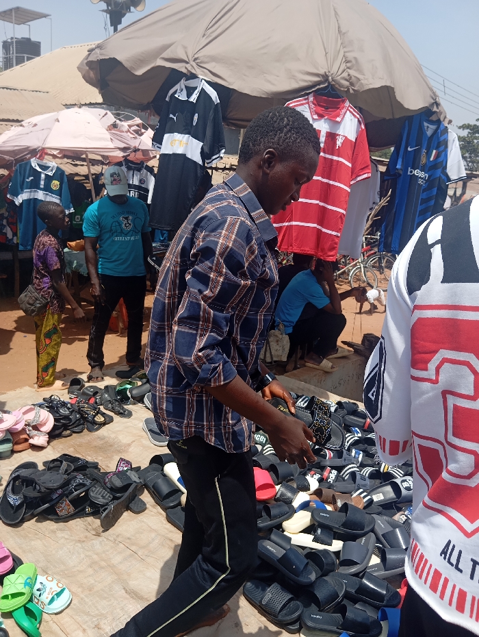 This image depicts an outdoor market scene in Lafia, Nigeria, during daylight hours. The environment is dusty, with an unpaved ground surface, partially covered by various merchandise. Overhead, a large, light brown market umbrella or awning provides shade, supplemented by a smaller, lighter-colored umbrella to the left. In the background, a dark water tank on a stand and a loudspeaker are visible. Several individuals are present. In the center foreground, a dark-skinned male, approximately young adult, wearing a blue and brown plaid long-sleeved shirt and black trousers with a light stripe, is standing and looking downwards. He holds a black sandal in his hands, appearing to examine items from a large display of various sandals and slide-style footwear spread across the ground. These items, predominantly black, white, red, and pink, are arranged in multiple piles. To the left, a dark-skinned child, wearing a purple patterned top and yellow/green patterned skirt, walks towards the left, carrying a brown shoulder bag. Behind this child, a dark-skinned adult male wearing a light blue t-shirt and a light-colored baseball cap stands, facing left. Further into the mid-ground on the right, another dark-skinned individual in a blue shirt is seated. Hanging from the market structures are several sports jerseys, including black and white, red and white, and blue and black designs. A bicycle is partially visible behind the hanging jerseys on the right side of the mid-ground.