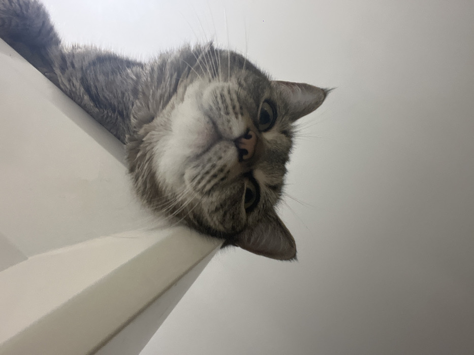 - "This image displays a domestic tabby cat from a low-angle perspective, positioned upside down in the frame" by FM-mWrWX2, licensed under CC BY 4.0