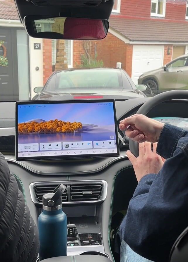 From inside a car, a man is seated in the driver's seat. He is wearing a denim jacket and a red beanie. The interior of the car is modern, with a large touchscreen display dominating the dashboard. A water bottle is visible in the center console. The man rotates the car's touchscreen 90 degrees to position the screen in portrait orientation. Outside the car, a residential street can be seen, with houses and parked cars.