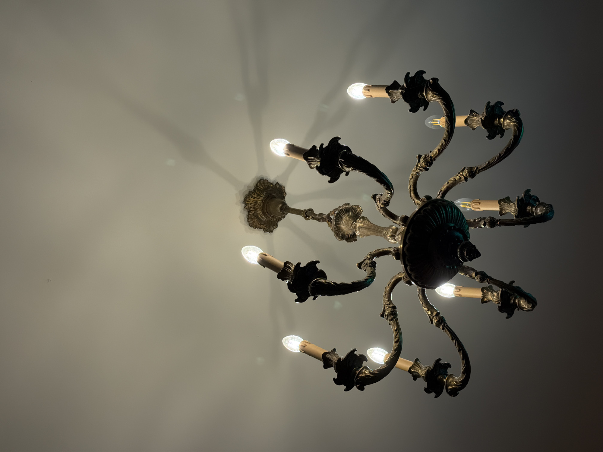 A low-angle forensic image captures an antique-style chandelier against a light-colored ceiling within the City of Edinburgh, United Kingdom. The chandelier features a dark metallic frame, likely bronze or dark brass, with eight ornate, scrolled arms extending radially from a central column. Each arm culminates in a candle-form holder. Eight candle-shaped LED or incandescent bulbs are installed; seven are clearly illuminated, emitting a bright, warm-white light, with one bulb on the lower right showing a visible filament. The chandelier is suspended from the ceiling by a decorative, lighter-toned metallic ceiling rose or canopy. Multiple distinct shadows, cast by the chandelier's arms and structure, are visible on the ceiling, primarily towards the upper right, indicating the light source's position relative to the camera. The ceiling exhibits minor textural imperfections and faint lens flares or light reflections. The lower portion of the image darkens, obscuring the room's lower sections. No individuals, further objects, or specific room details are identifiable.