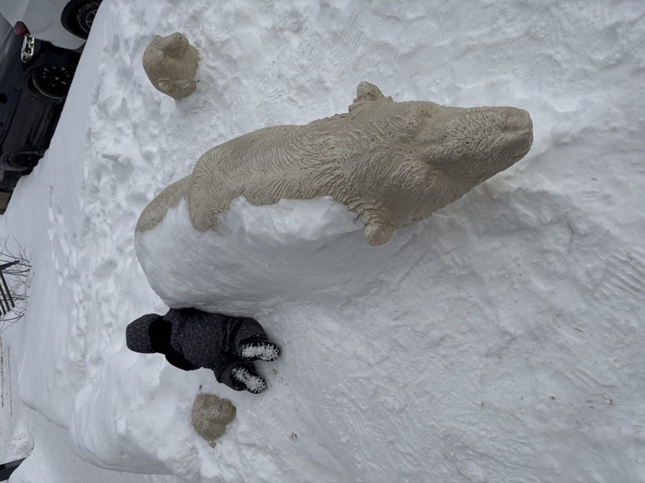 The image displays an outdoor winter scene in Izhevsk, Russia, under overcast lighting conditions with extensive snow cover on the ground. A large, light-colored sculpture of a polar bear, partially encrusted with snow, occupies the central and right portions of the foreground, oriented with its head facing towards the upper right. The sculpture exhibits a textured surface resembling fur. To the immediate left of this sculpture, a young child dressed in a grey and black patterned winter snowsuit with a hood is positioned on their hands and knees, facing away from the camera. The child's black boots with visible treads are prominent. Two smaller, light-colored animal head sculptures, also partially covered by snow, are visible: one situated to the left of the child's position and another further back to the right, behind the main polar bear sculpture. In the upper right background, several parked vehicles, including at least two dark-colored cars and one lighter-colored vehicle, are visible along a snow-lined roadway or parking area. A dark, angular metal structure is partially visible in the upper left background, behind a bank of snow.