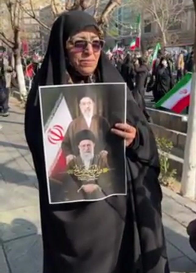 An elderly woman wearing a black chador and sunglasses stands on a sidewalk, holding a photograph of two men, with an Iranian flag in the background. She stands in front of a crowd of people, many also wearing black clothing, walking down a street lined with trees. Iranian flags are visible throughout the crowd. The scene appears to be a public gathering or demonstration. The sky is clear and the weather appears to be sunny.