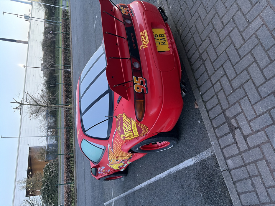 A red Mitsubishi GTO, customized to resemble "Lightning McQueen" from Disney Pixar's *Cars*, is parked in an asphalt lot in Harlow, United Kingdom