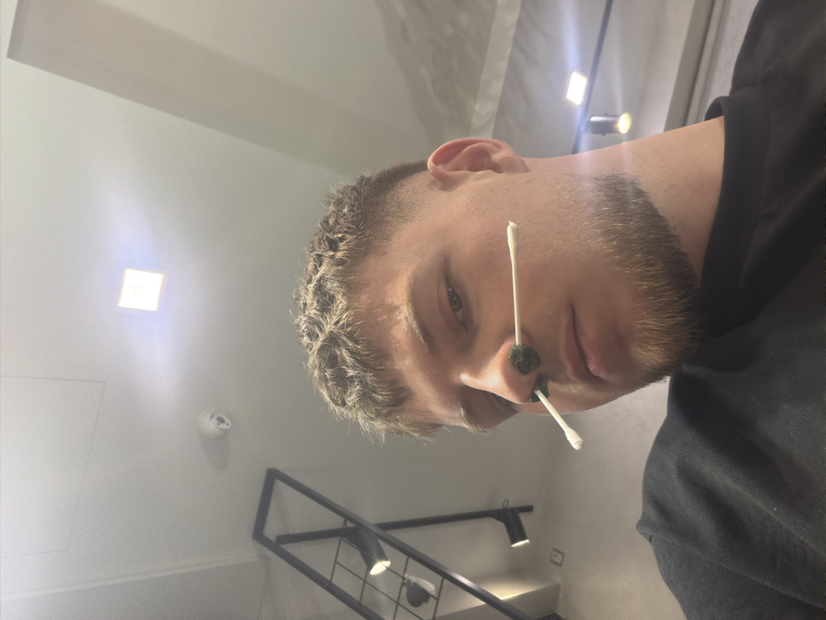 A male individual is depicted in a close-up, upward-angle photograph taken indoors in Sofia, Bulgaria. The subject has short, light brown textured hair with faded sides and a short beard. He wears a dark-colored crewneck shirt and looks directly at the camera with a neutral expression. Two white cotton swabs are inserted into his nostrils, extending horizontally outwards. Between the two cotton swabs, on the bridge of his nose, rests a small, dark green, textured substance. The background features a light-colored ceiling where a white dome-shaped security camera is mounted. Multiple light sources are visible: a bright square recessed light in the upper right quadrant and two cylindrical spotlights attached to a black metal grid structure on the left side of the frame. The visible walls are light in color.