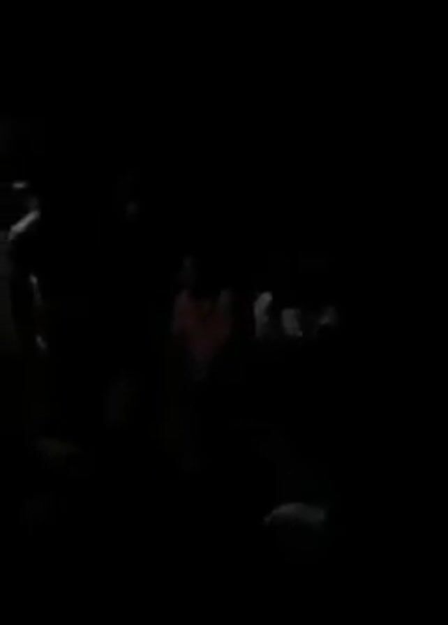 A dimly lit indoor scene shows several people dancing and standing around. The lighting is poor, but outlines of figures and movement are visible. One person standing near the doorway is highlighted by the light coming in from outside. The group seems to be gathered for a lively event, judging by the dynamic movements and spacing.