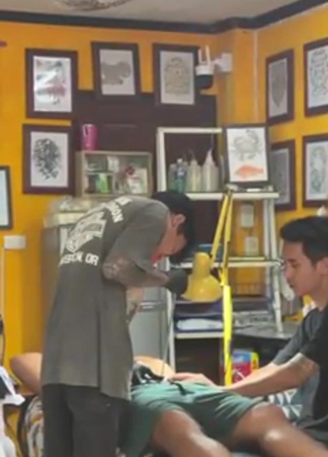 - "In a brightly lit tattoo parlor with yellow walls adorned with framed tattoo designs, a person lies on a bed while a tattoo artist applies a tattoo to their midsection" by FM-wUaYc2, licensed under CC BY 4.0