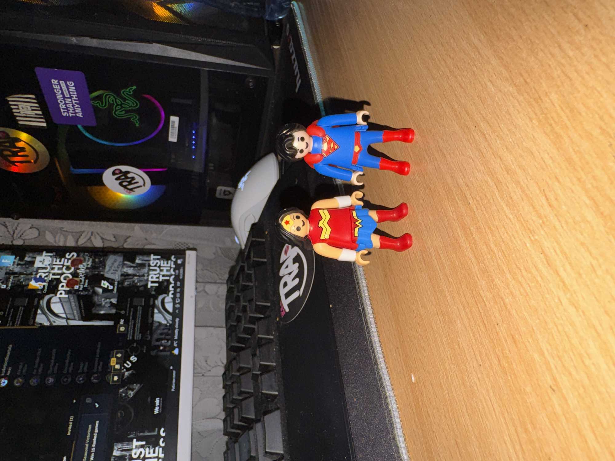 The scene shows a computer setup. A black computer tower with a Razer logo and several stickers is visible to the left. Next to it is a black keyboard and a white computer mouse. The screen displays a desktop with icons and a Discord window. Two Playmobil figures of Superman and Wonder Woman are placed on the edge of the desk, which has a light brown, wood-like surface. The overall environment appears to be a desk area. No location in the city of Pleven, Bulgaria is discernible.