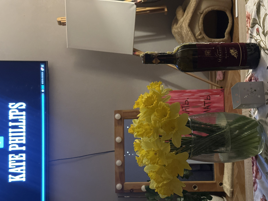 - "A still life features daffodils in a ribbed vase, a Miradór red blend wine bottle, and a small gift box with snowflakes" by FM-OGYsl2, licensed under CC BY 4.0