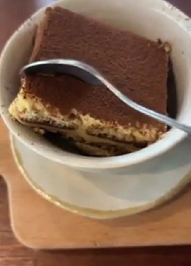 A close-up shot shows a portion of tiramisu dessert in a white ceramic bowl, sitting on a smaller saucer atop a wooden tray