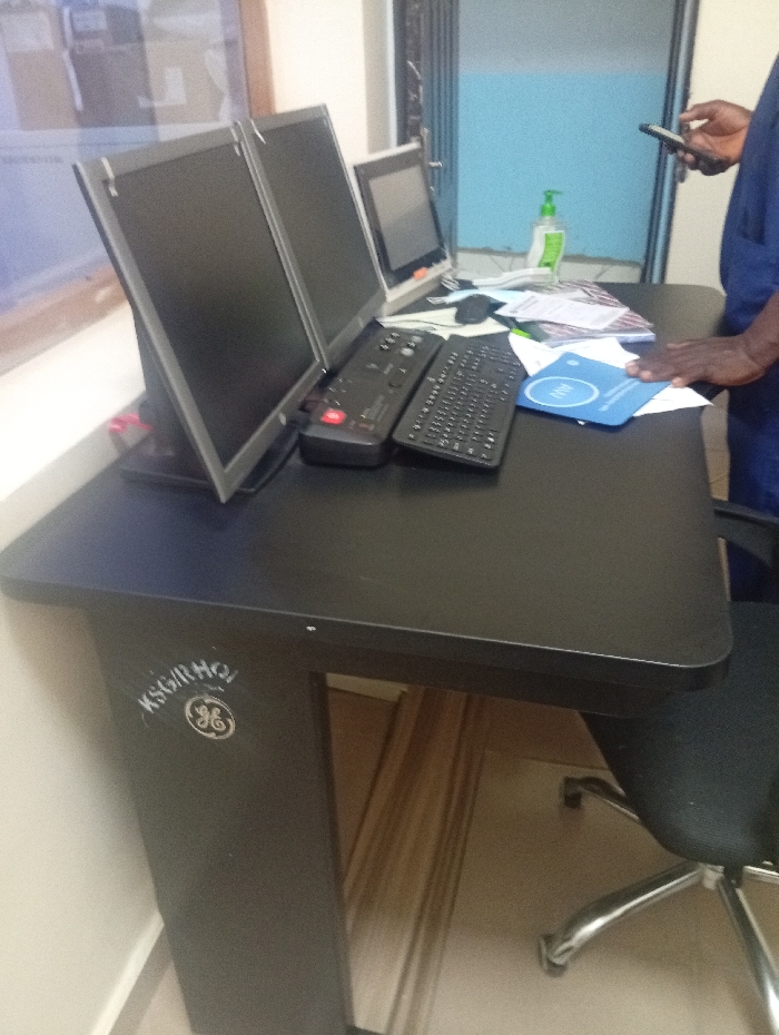 The image displays an indoor workstation located in Okengwe - Obehira, Nigeria. The central object is a dark-colored desk with a rectangular top and rounded corners. The desk's left support leg features white stenciling that reads "KSG/RHO" above a General Electric (GE) logo. Arranged on the desk surface are three computer monitors: two identical, dark-colored flat-panel displays are positioned side-by-side on the left, with their screens off. A third, smaller, silver-framed monitor is situated to the right of the paired monitors. In front of the monitors are two black keyboards—one standard QWERTY and one specialized multi-button control keyboard—along with a black computer mouse. A green pump-dispenser bottle and a stack of papers are located behind the keyboards. A blue document or folder, featuring a white logo, rests on the desk's right side. A partially visible individual is present on the right side of the frame. This individual is wearing a blue uniform or scrubs. Their right hand holds a dark-colored smartphone, while their left hand rests on the blue document on the desk. The individual's skin tone is dark. The background includes a light-colored wall on the left, a window reflecting ambient light, and a blue wall section with a metallic accordion-style security gate or shutter on the right. A black office chair with a chrome base is partially visible beneath the desk. The floor directly under the desk is light-colored.