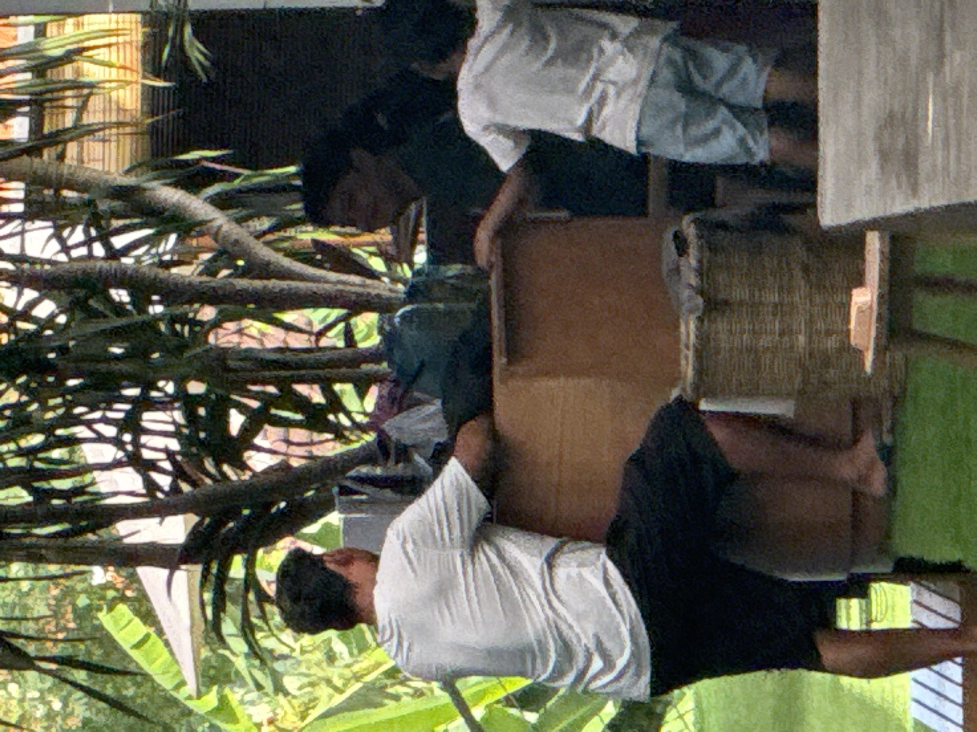 The image depicts two individuals moving furniture outdoors in North Kuta, Indonesia. One person, wearing a dark shirt and dark shorts, appears to be lifting a cardboard box. Another person, wearing a white shirt and light-colored shorts, assists. The scene is set amongst trees and foliage, possibly in a residential yard or garden. A table is situated nearby.