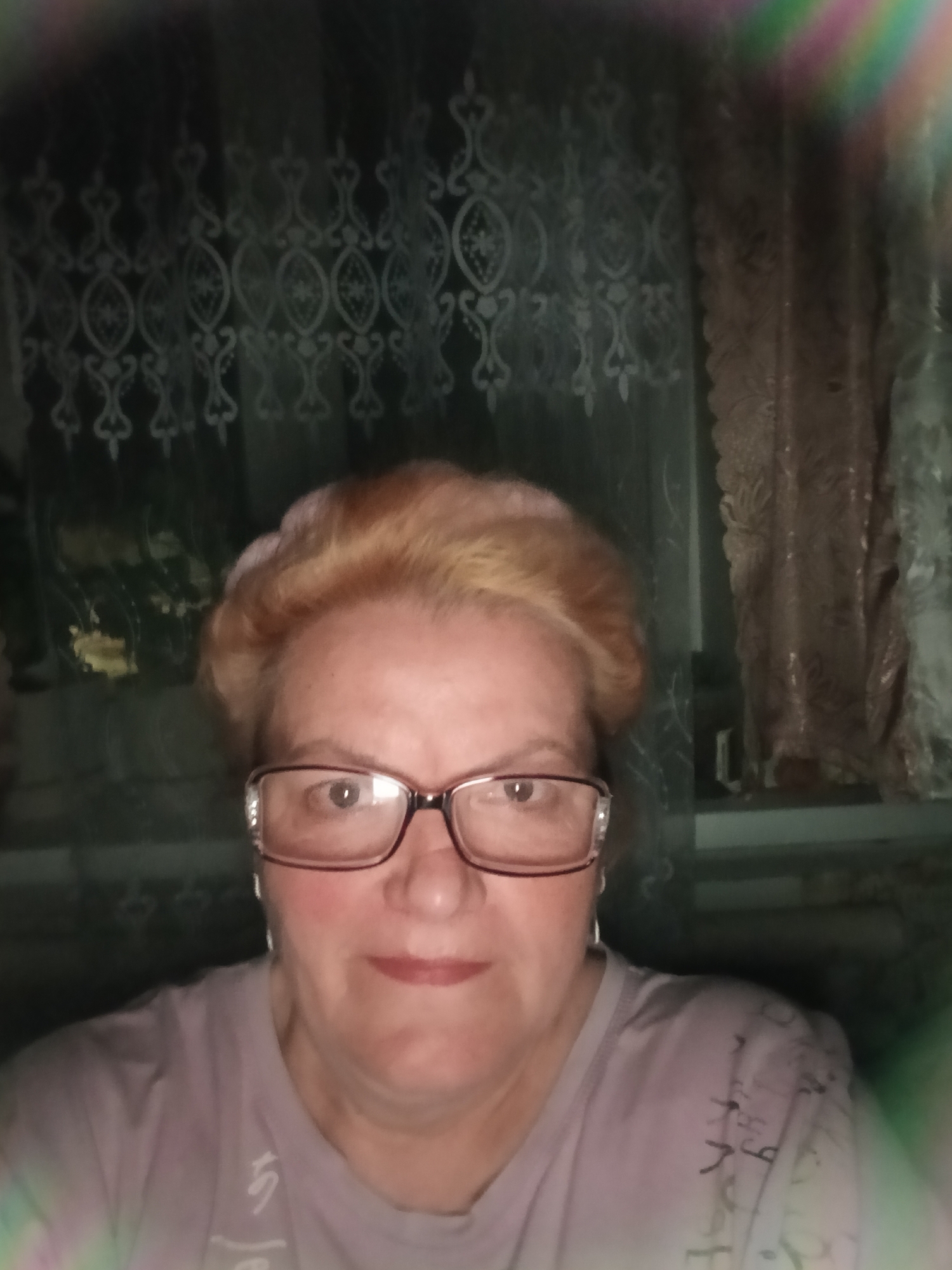 A medium close-up photograph shows an elderly woman with light brown hair and glasses. She is wearing a light purple t-shirt. In the background are curtains with a patterned design. The scene appears to be indoors. There is no information to confirm this image was taken in Красный Маяк, Russia.